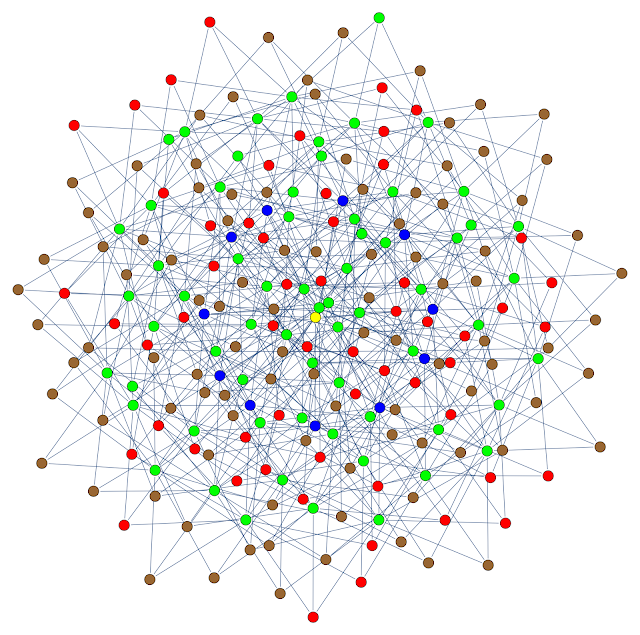 To get an visualize the situation, I create the graph below. The vertices are some of the points in the code space: the sphere of radius three centered around one of the code words. The color coding is